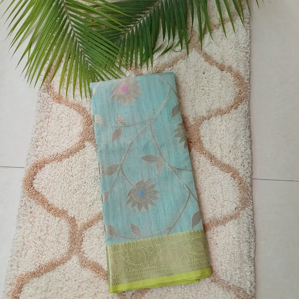 Sea green tasar minakari saree with dhani border, flower jaal and running blouse.